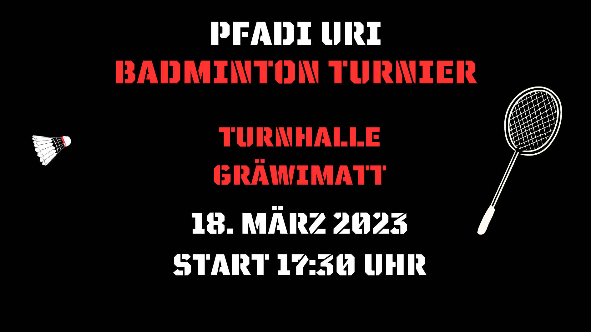 März42023EventPfadi Uri Badmintonturnier 2023 Turnhalle Gräwimatt Schattdorf 18. März 2023 Start 17:30 Uhr Anmeldeschluss 12. März 2023 Teilnahme im Doppel PODEST - UND KOSTÜMPREIS ZU GEWINNEN --> Hier Anmelden <-- Von SmartMärz 4, 2023KommentarnavigationZurückVorheriger Beitrag:Dankesanlass in GöschenenNächstesNächster Beitrag:Roverbar 2023