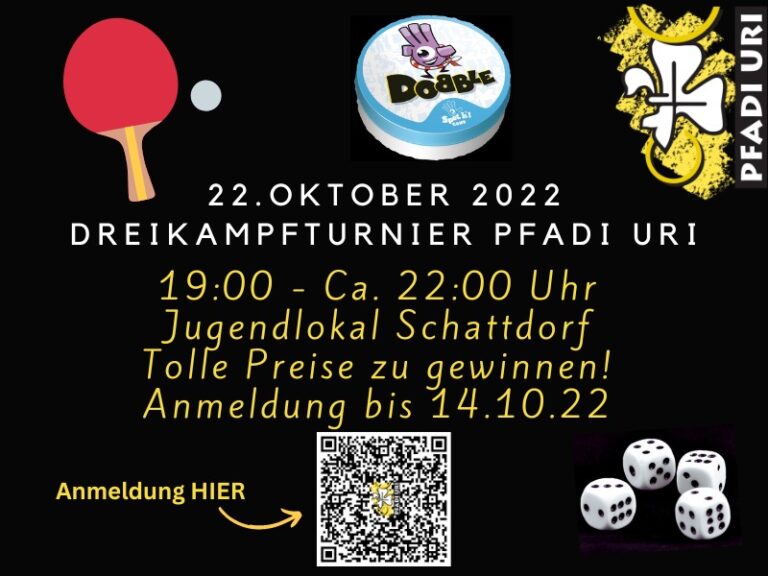 Dreikampfturnier ‚ 22 https://pfadi-uri.ch/wp-content/uploads/2022/09/WhatsApp-Video-2022-09-28-at-13.06.37.mp4 22.Oktober.2022 19:00 – 22:00 Uhr Jugendlokal Schattdorf Tolle Preise zu gewinnen Hier Anmelden Jetzt Anmelden