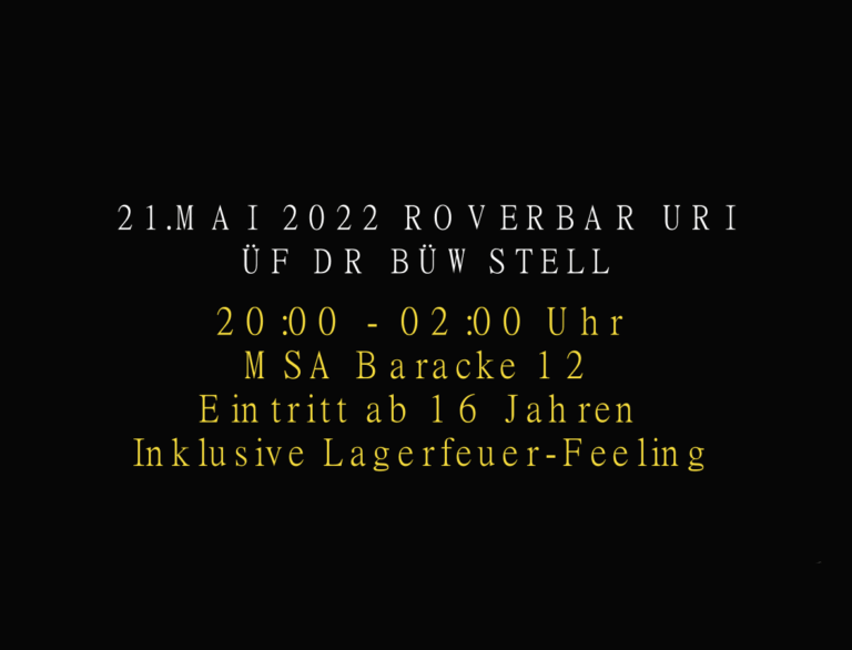 Roverbar 21.05.22 https://pfadi-uri.ch/wp-content/uploads/2022/05/ezgif.com-gif-maker.mp4 21. Mai. 2022 20:00 – 02:00 Uhr MSA Baracke Altdorf Eintritt ab 16 jahren Mit Lagerfeuerstimmung